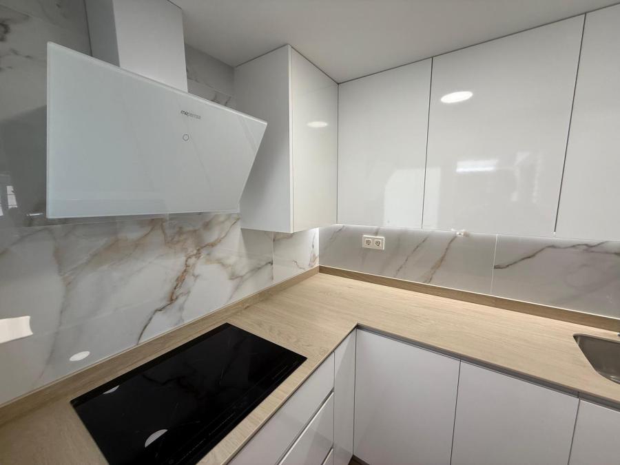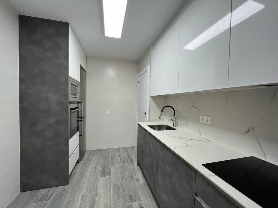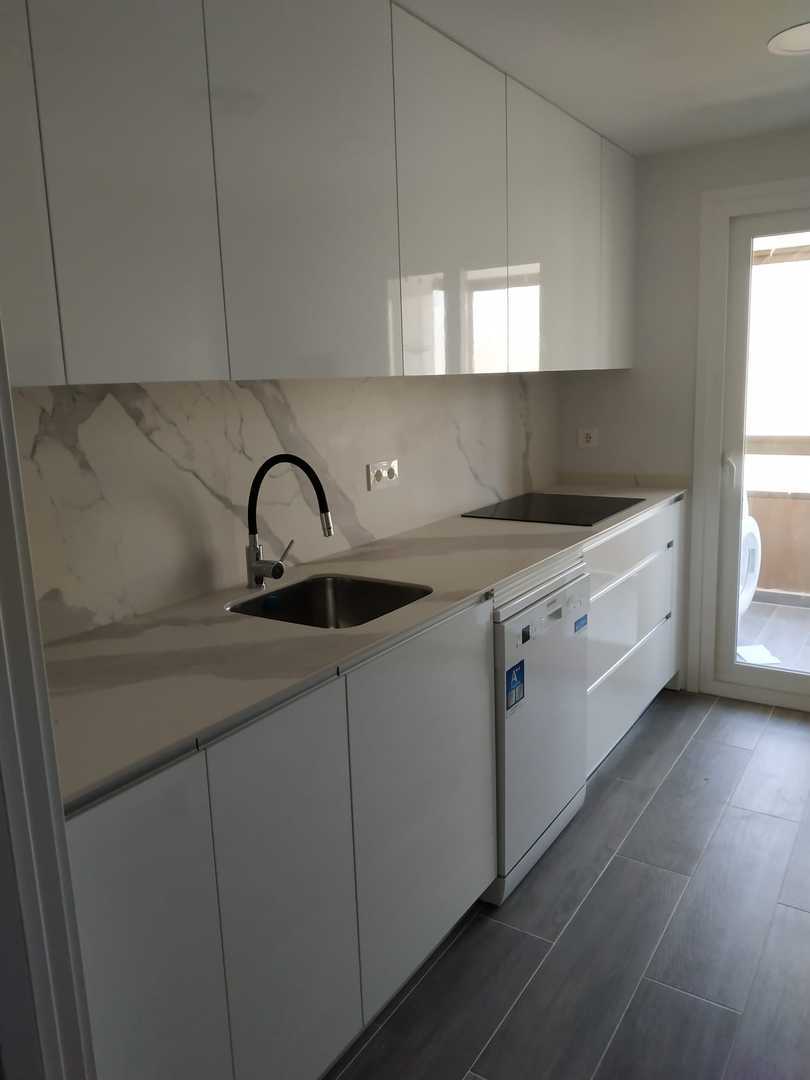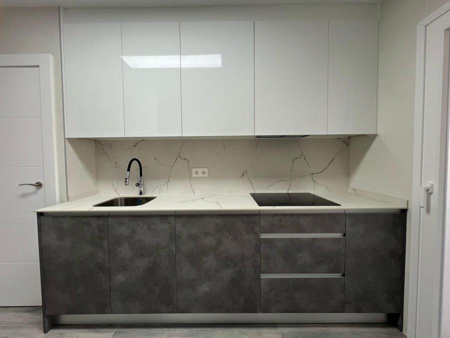 reformas integrales de cocinas en Zaragoza, Zumalacárregui 10, suelos imitación madera, encimeras neolith summer dala silk, muebles formica blanco brillo, baldosas porcelánicas en pared de cocina